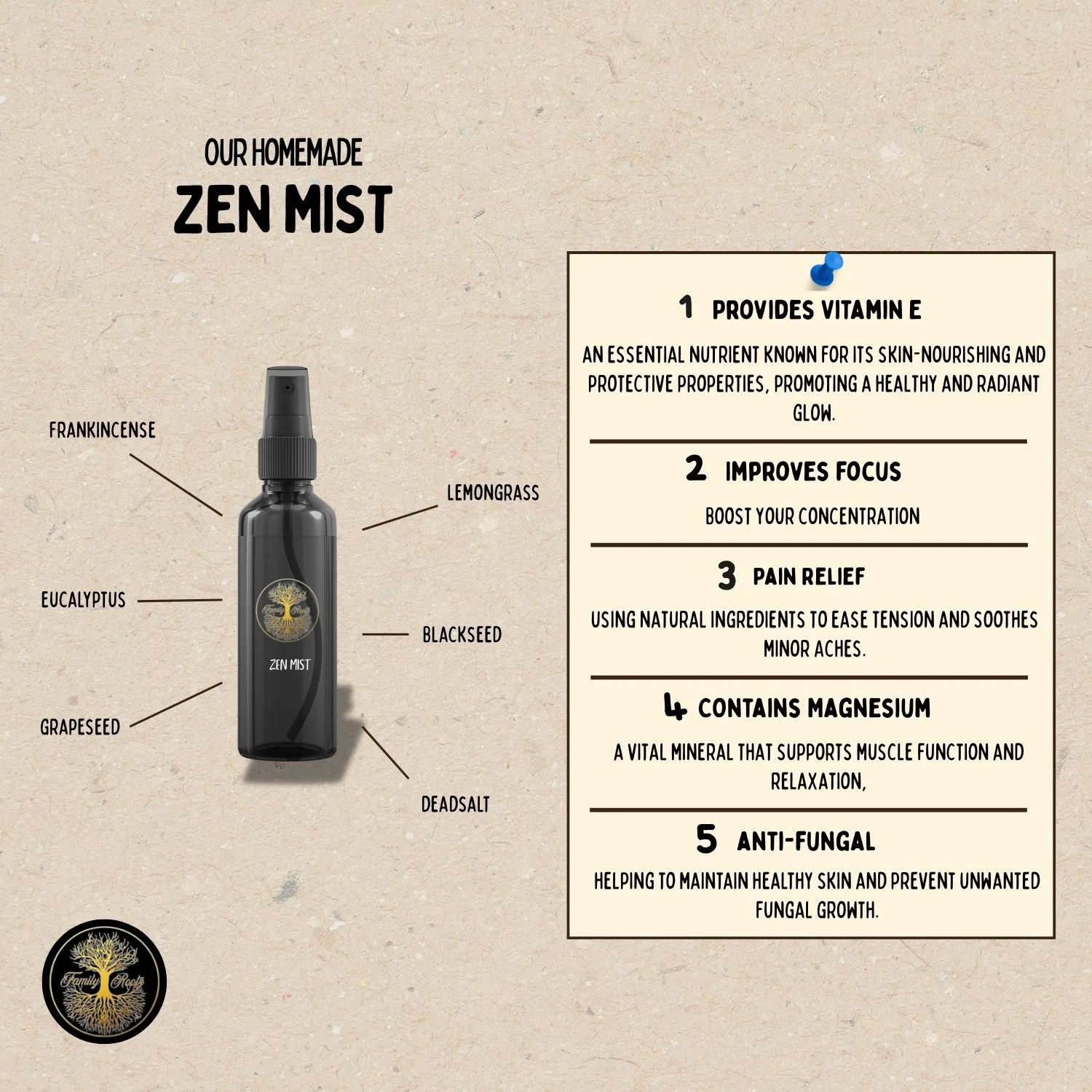 Product description Zen Mist is a balanced essentials blend built on a blackseed and grapeseed carrier base. Designed to evoke the calm of rain over the sea, it combines marine-fresh top notes with a gentle herbal heart and an earthy, slightly spicy base. The result is a clean, grounding aroma that reads both crisp and comforting — like standing at the shore as a warm spring rain begins.